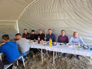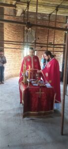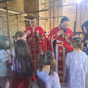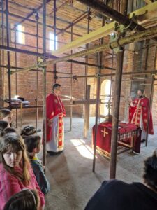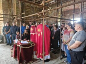 – Сваки велики рад захтева велики број људи, а у свему томе вас води љубав Христова, која вас обједињује у Цркви око Христа Господа. То смо и видели данас кроз вашу децу, коју сте довели да причестите и приведете Христу на васпитање и спасење. Ви сте овде изузетно вредан народ, који уз организацију вашег свештеника завршисте цркву Божију, а ево видим да је и крст припремљен за освећење. Нека Вам Бог и Свети великомученик Георгије помогну да у потпуности завршите храм, који ће остати за сву вечност овде на земљи вама и вашој деци- поручио је јеромонах Андреј.