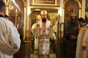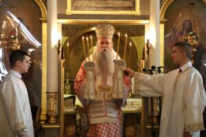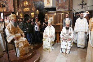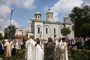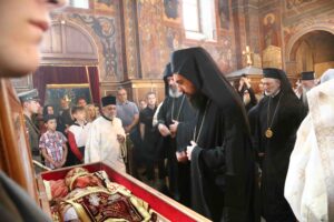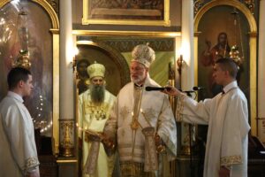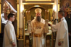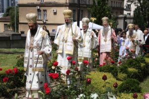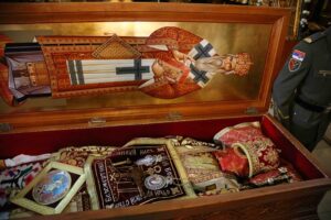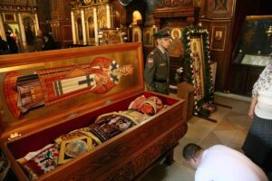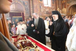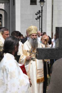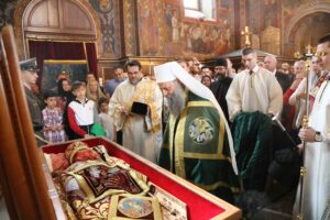 Његова Светост Патријарх српски г. Порфирије служио је 25. маја 2023. године, на празник Вазнесења Господњег – Спасовдан, свету Литургију у београдској Вазнесењској цркви крај моштију Светог владике Николаја Српског, које су дан раније пристигле из манастира Лелића.