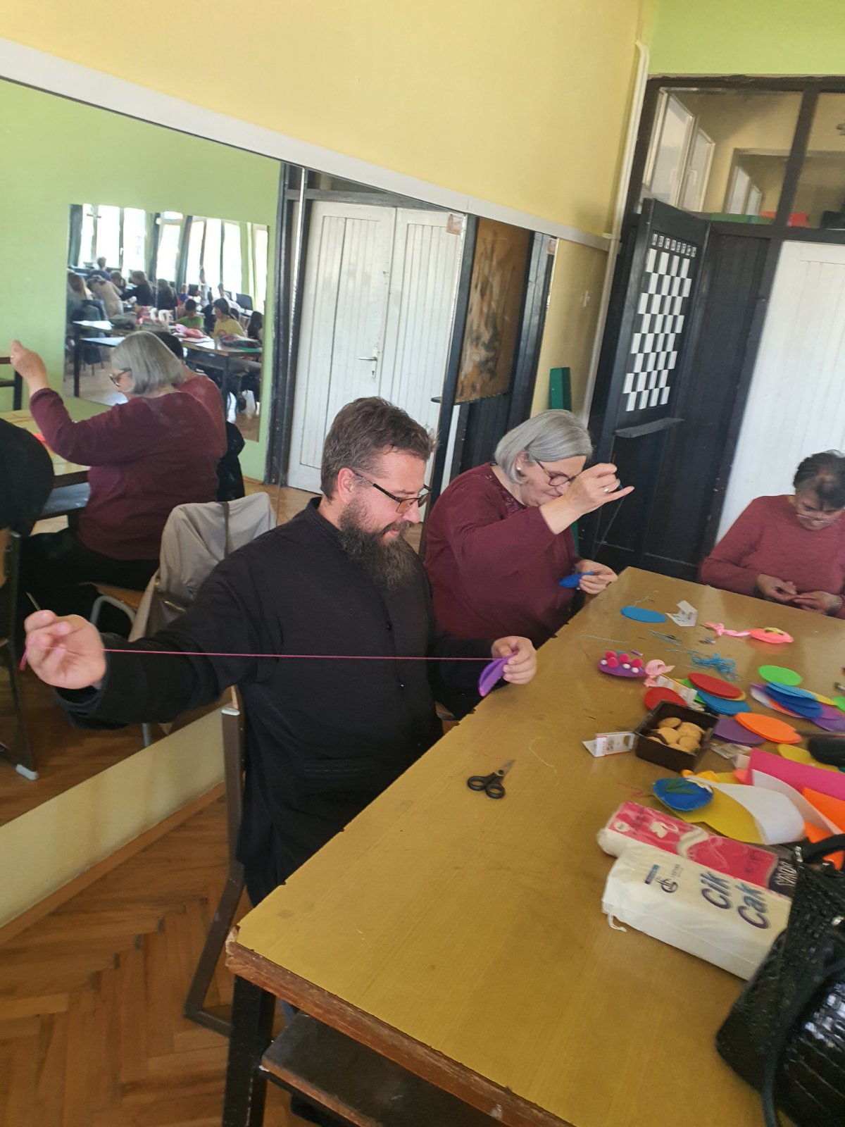 На васкршњој радионици у суботу 20. априла.2024. године имали су и госте. То су биле сестре из Кола при Храму Васкрсења Христовог са својим духовником јерејем Александром Филиповићем, а ни понеки родитељи нису одолели да се лате игле, конца и лепка!