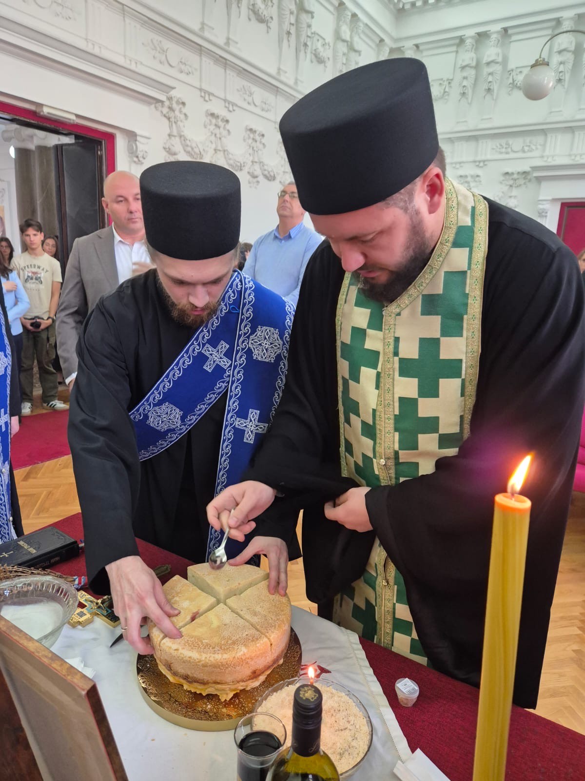 “Мудре су биле главе које су донеле одлуку да Ваљевска гимназија слави Светог Јована Златоустог, зато што је он човек и светитељ који је био веома образован и све своје знање је охристовио, односно ологосио”, рекао је протонамесник Филип Јаковљевић, архијерејски заменик Преосвећеног Епископа ваљевског г. Исихија, у обраћању свечарима након ломљења славског колача у свечаној сали школе са директором Предрагом Јевтићем, наставницима и ученицима.