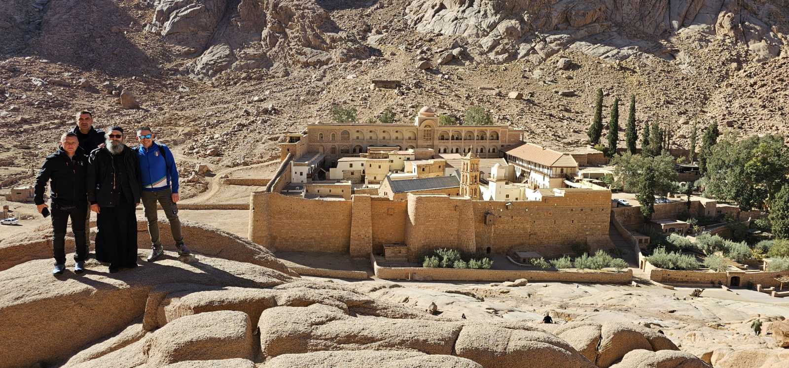 Манастир Свете Екатарине на Синају, који се налази усред камените пустиње, био је главни циљ овог поклоничког путовања. Подигла га је царица Јелена, мајка Светог цара Константина, а међу ктиторима и дародавцима су и Свети краљ Милутин Немањић и Свети кнез Лазар Хребељановић. Поред моштију Свете Екатарије, поклоници су целивали и мошти Светог Стефана Синаитског, свеца који се упокојио у седећем положају, а чије нетљене мошти су тако и положене. Посебан доживљај било је пењање на Мојсијев врх, најсветије место у Јевреја, тачку на којој му је Господ дао таблицу са 10 Божјих заповести. Успон има 8 км, веома је тежак и и напоран, и у тамошњој капели, више свештенослужитеља, који су били међу путницима такође, служили су Свету Литургију. Мојсијев бунар, несагориву купину, богату манастирску ризницу, поклоници су имали прилике да виде. Међу путницима су били и: отац Георгије, игуман Манастира Лелић, отац Николај, сабрат Манастира Хиландар, протонамесници: Александар Вучај, архијерејски намесник посавски и Дарко Ђурђевић, архијерејски намесник други ваљевски и Аранђел Петровић, клирик Епархије жичке.