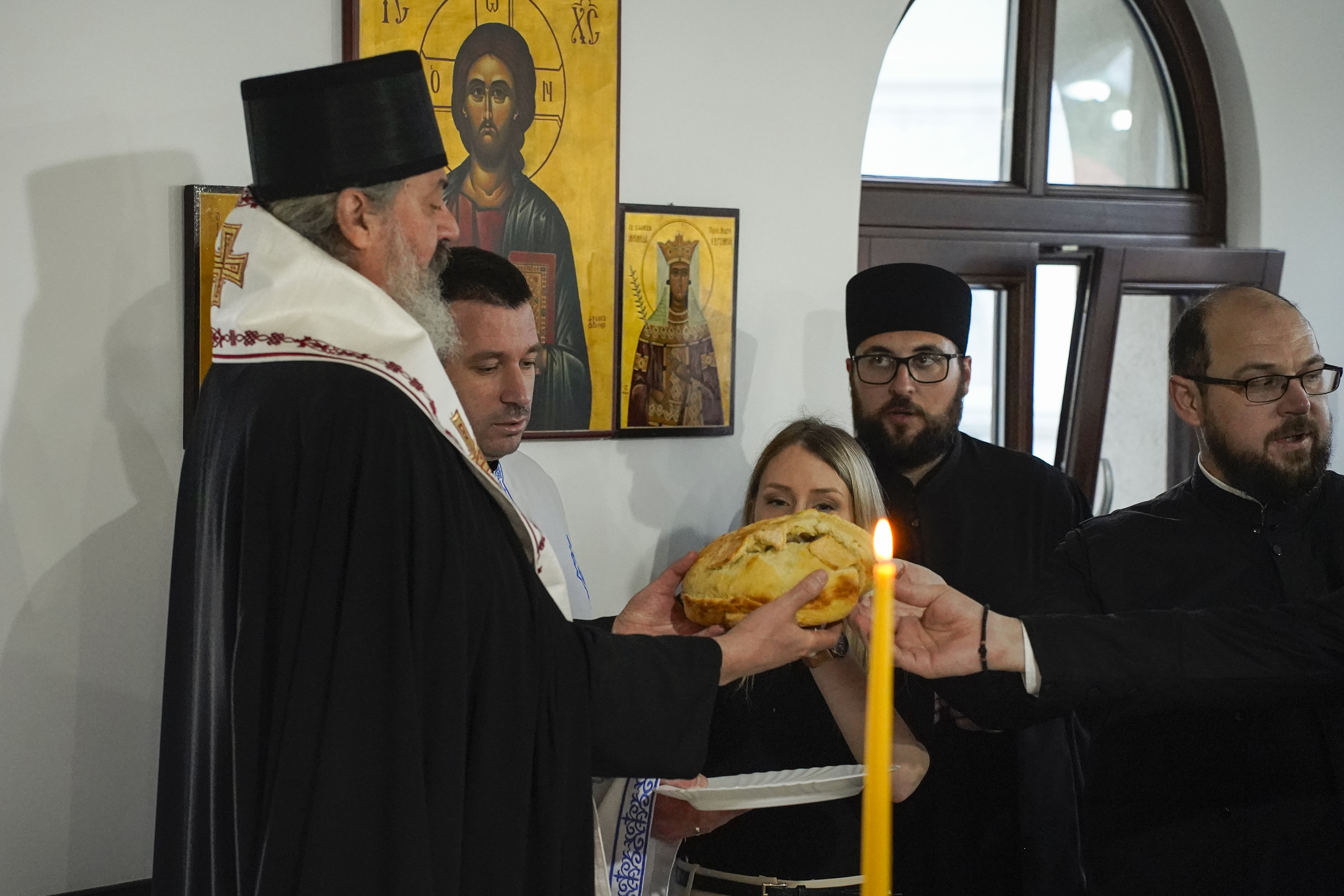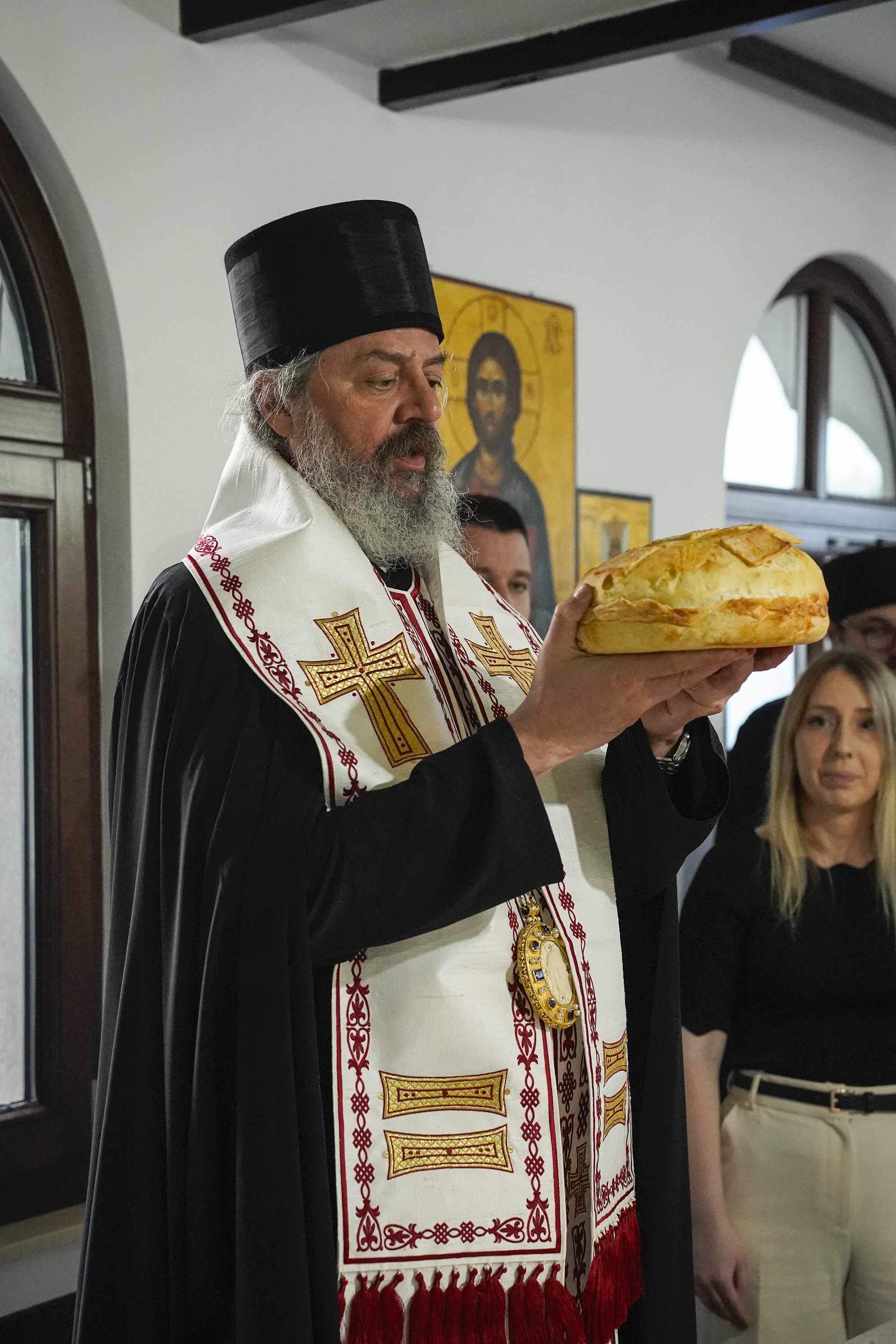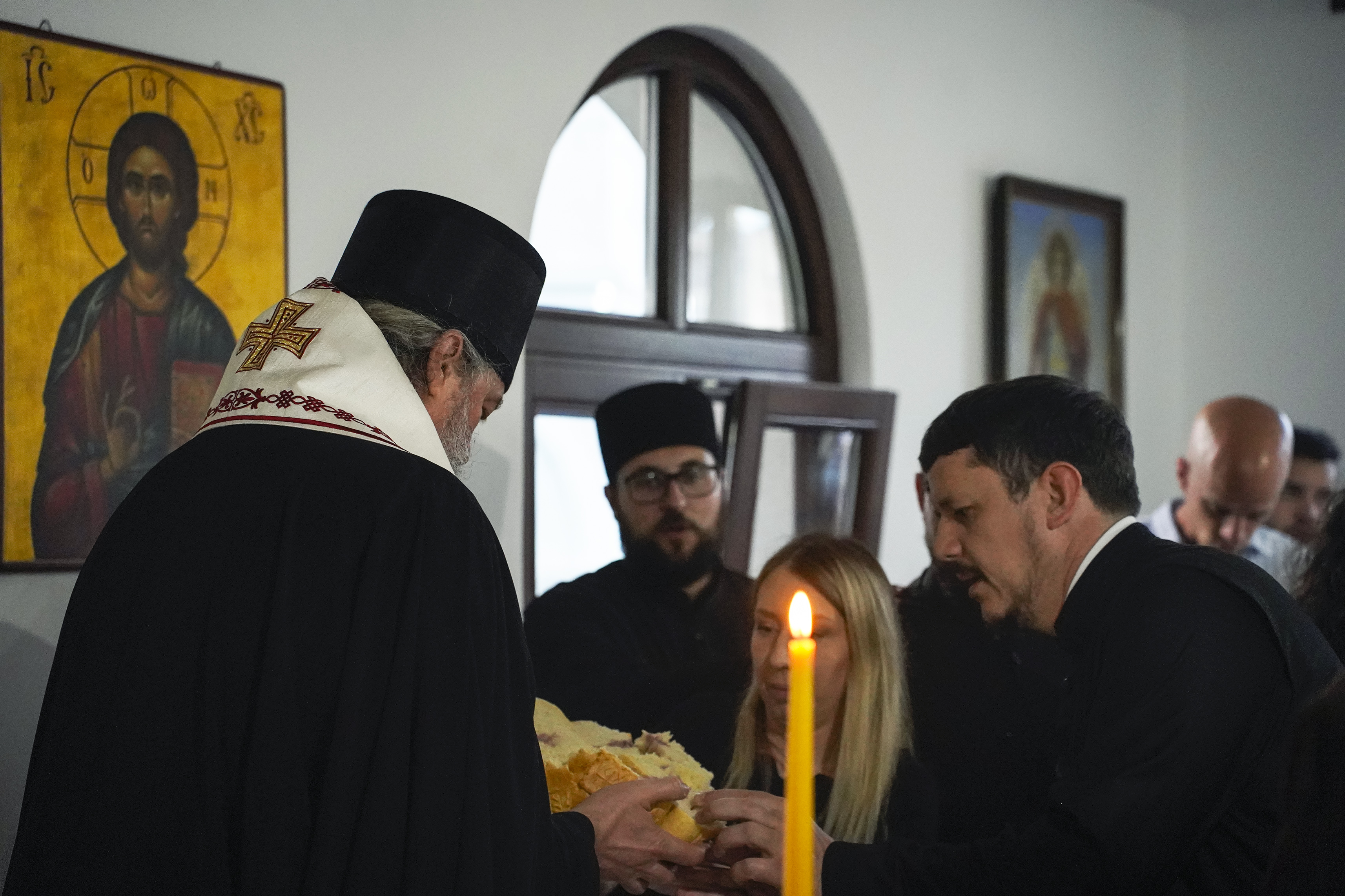 Његово Преосвештенство Епископ ваљевски г. Исихије преломио је славски колач са свечарима и гостима у парохијском дому Храма Покрова Пресвете Богородице, пожелевши им да по узору на анђеле песмом славе Бога