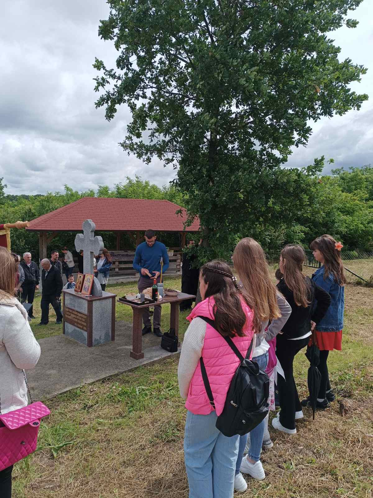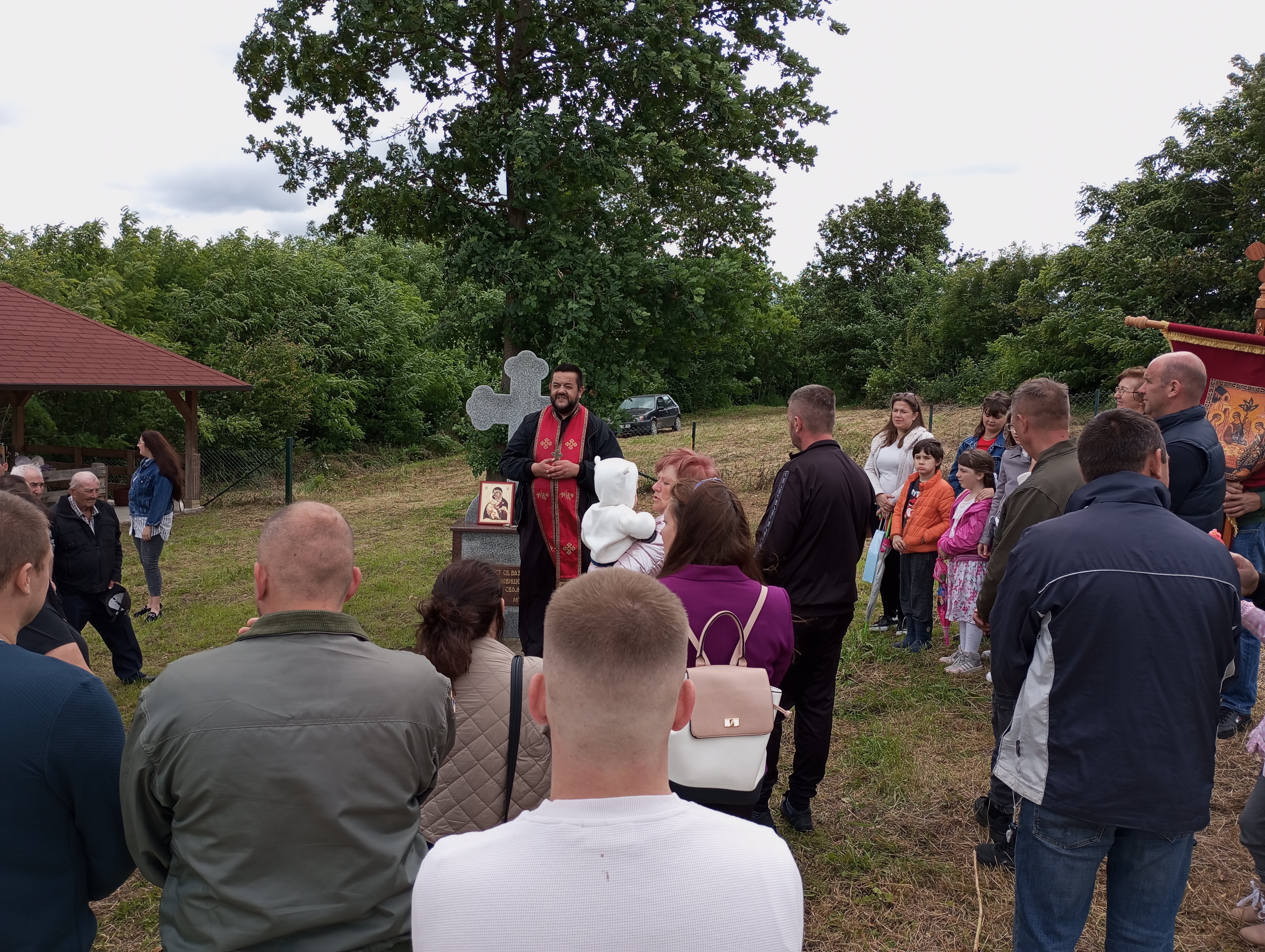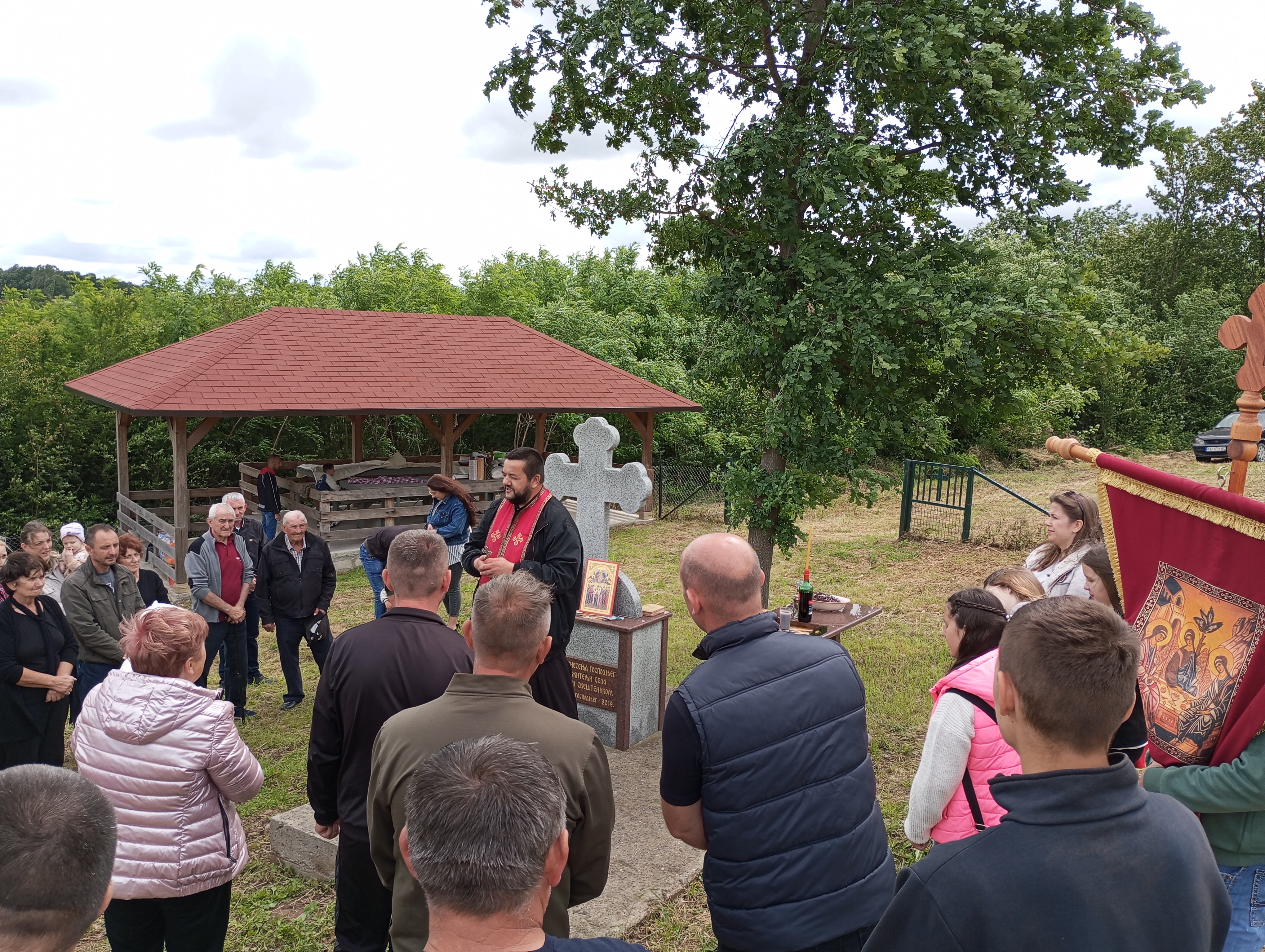 У селу, код Крста, након литије освећена је водица и пререзан славски колач.