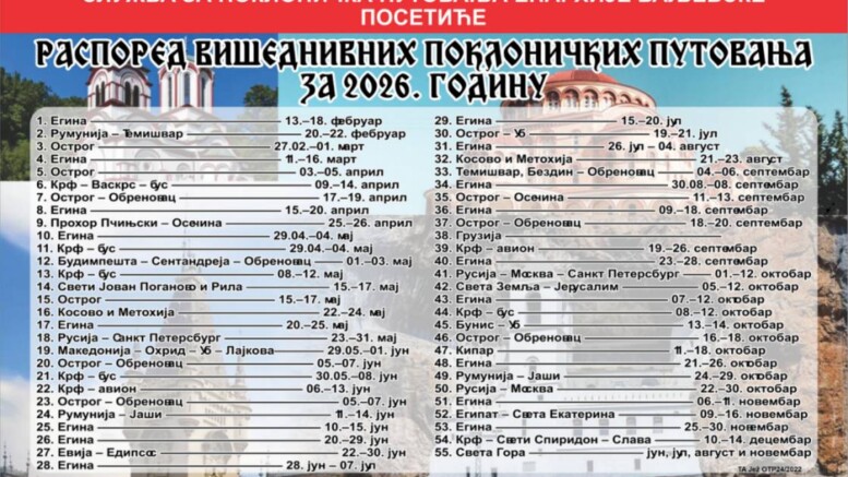 Распореди једнодневних и вишедневних поклоничких путовања Епархије ваљевске